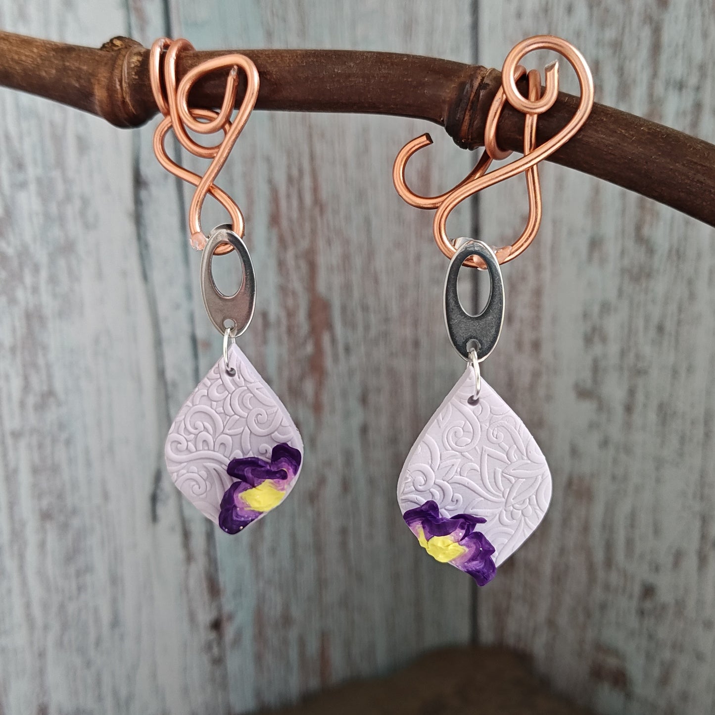 Lavender 3D design with a purple flower in polymer clay stud/dangle earrings.
